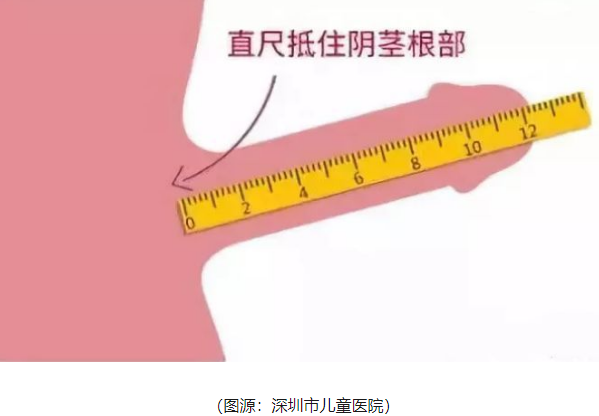 外牵拉至最大长度,测量阴茎头顶端(不是包皮末端)距离阴茎根部的距离