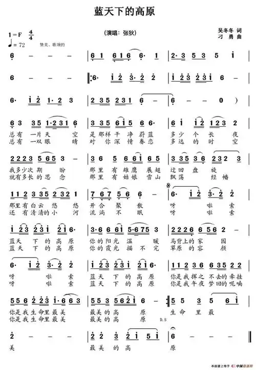 蓝天下的高原(张狄版)》吴冬冬作词 刁勇作曲 张狄演唱 ,原创歌曲简谱