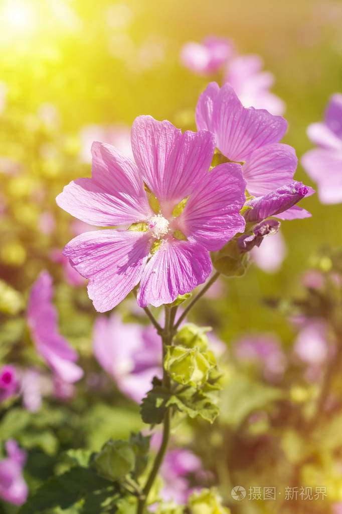 清晨, 阳光下的花朵简单而可爱, 照亮了粉红色的花瓣.