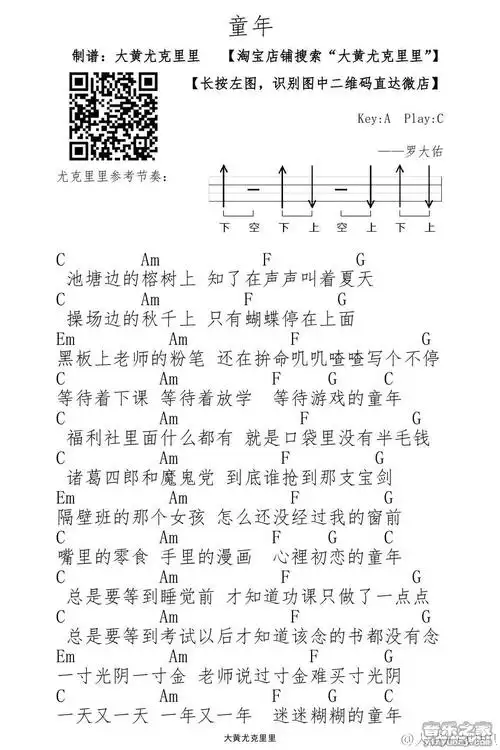 大黄版 罗大佑《童年》尤克里里弹唱谱