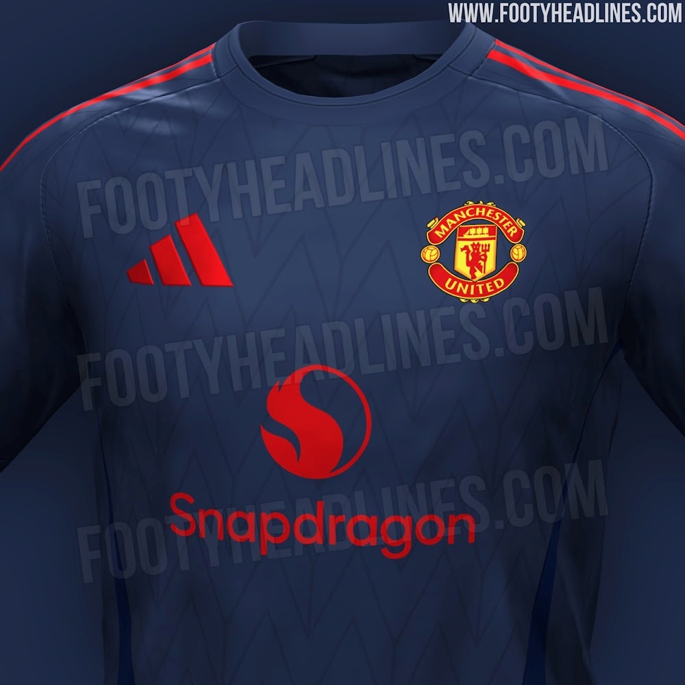 曼联下赛季客场球衣谍照海军蓝主色调红色正面使用m形图案