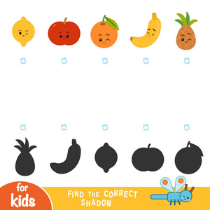 找正确的影子,给幼儿游戏.带着滑稽面孔的水果照片