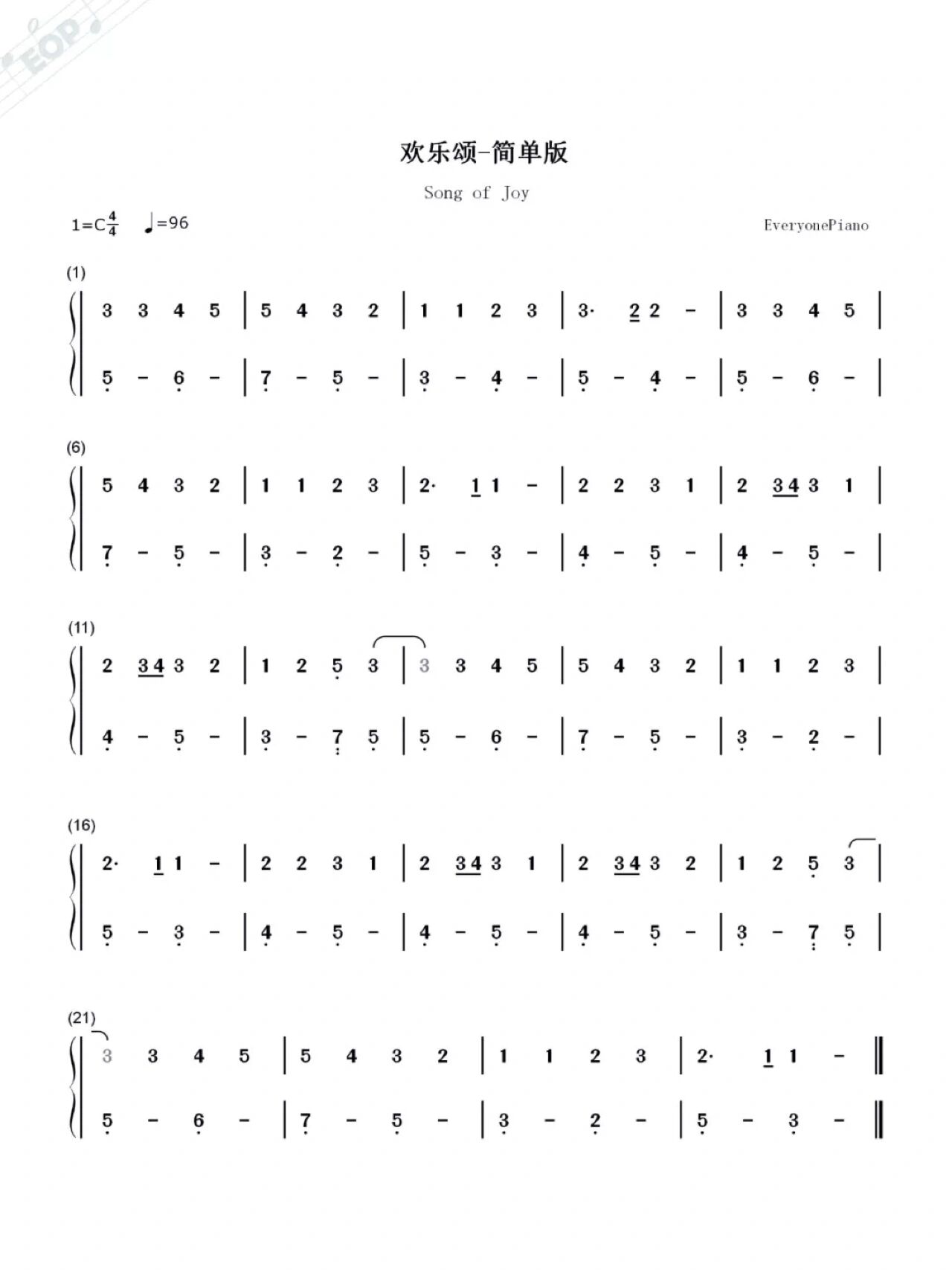【欢乐颂】最简单版-钢琴双手简谱入门必学~ 欢乐颂,又称《快乐颂》