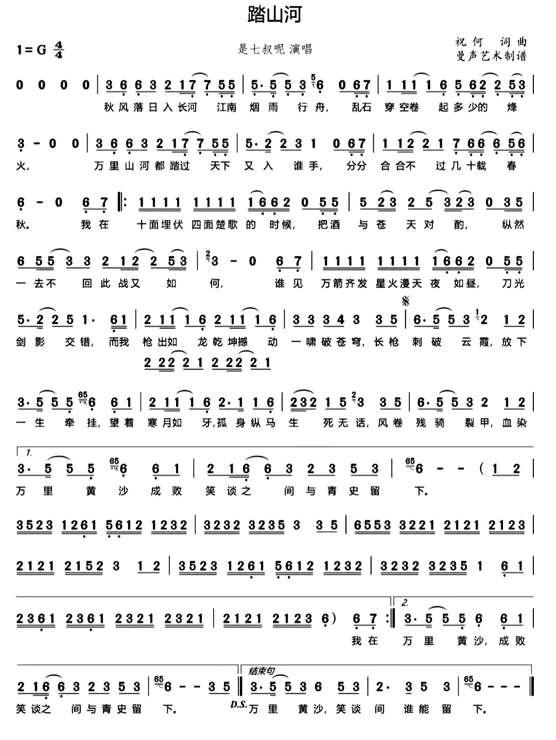 七叔叶泽浩演唱踏山河的光标跟随动态有声简谱