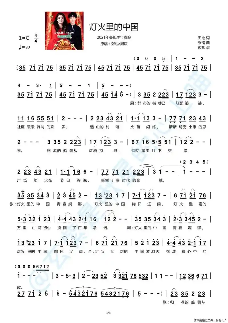 周深/张也《灯火里的中国》简谱.扒谱不易,请不要二次搬运,谢 - 抖音