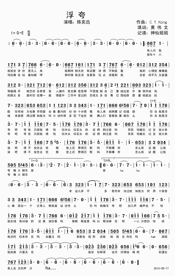 天真(盗墓笔记)浮夸(陈奕迅) 钢琴双手简谱 原版 钢琴谱 钢琴简谱