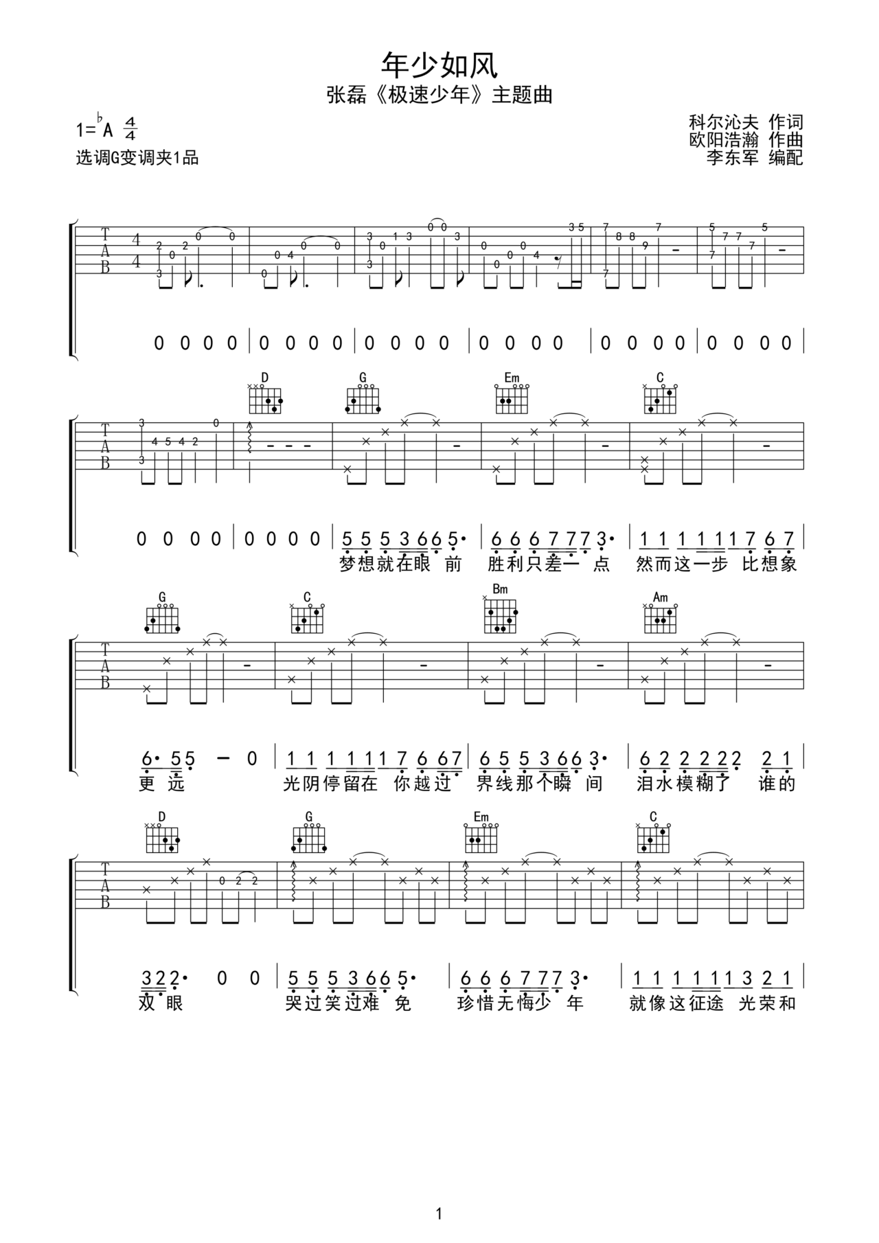 《年少如风吉他谱》_张磊_g调_吉他图片谱3张