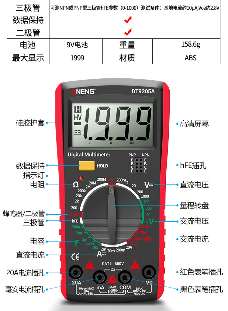 电工dt9205a高精度电子万用表数字万能表 万用电表防烧带自动关机