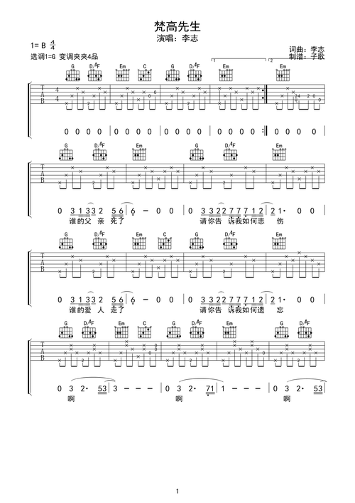 李志《梵高先生》吉他谱-g调