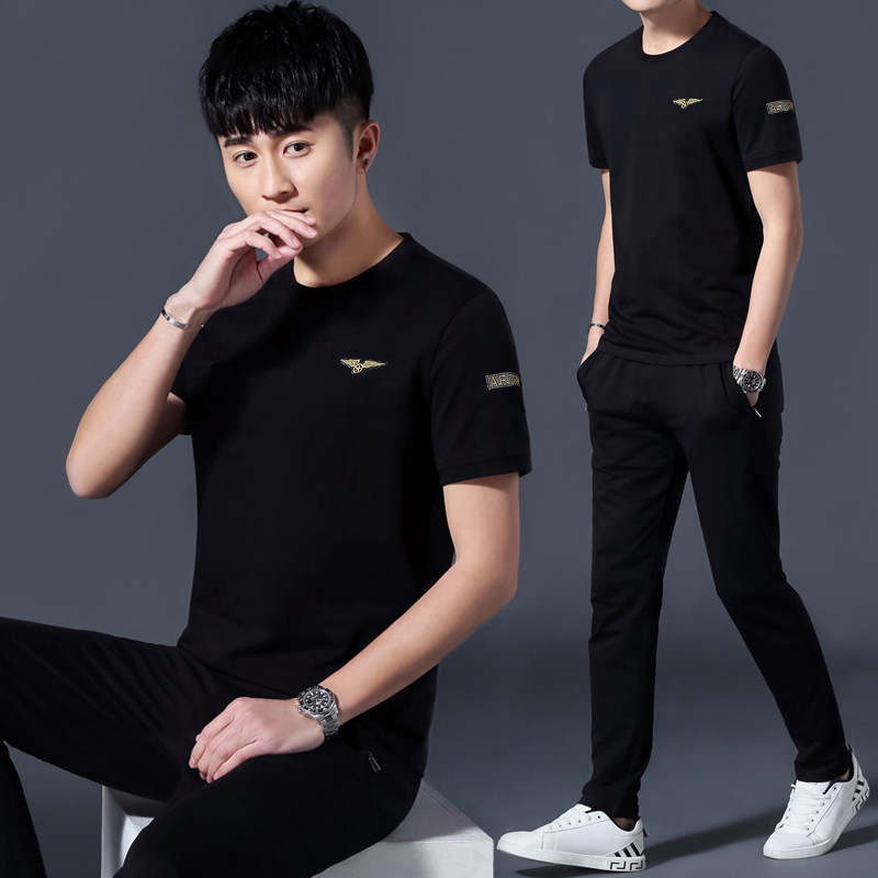 男士套装2018新款夏装男装韩版潮流衣服男短袖t恤夏季休闲套装男 白色