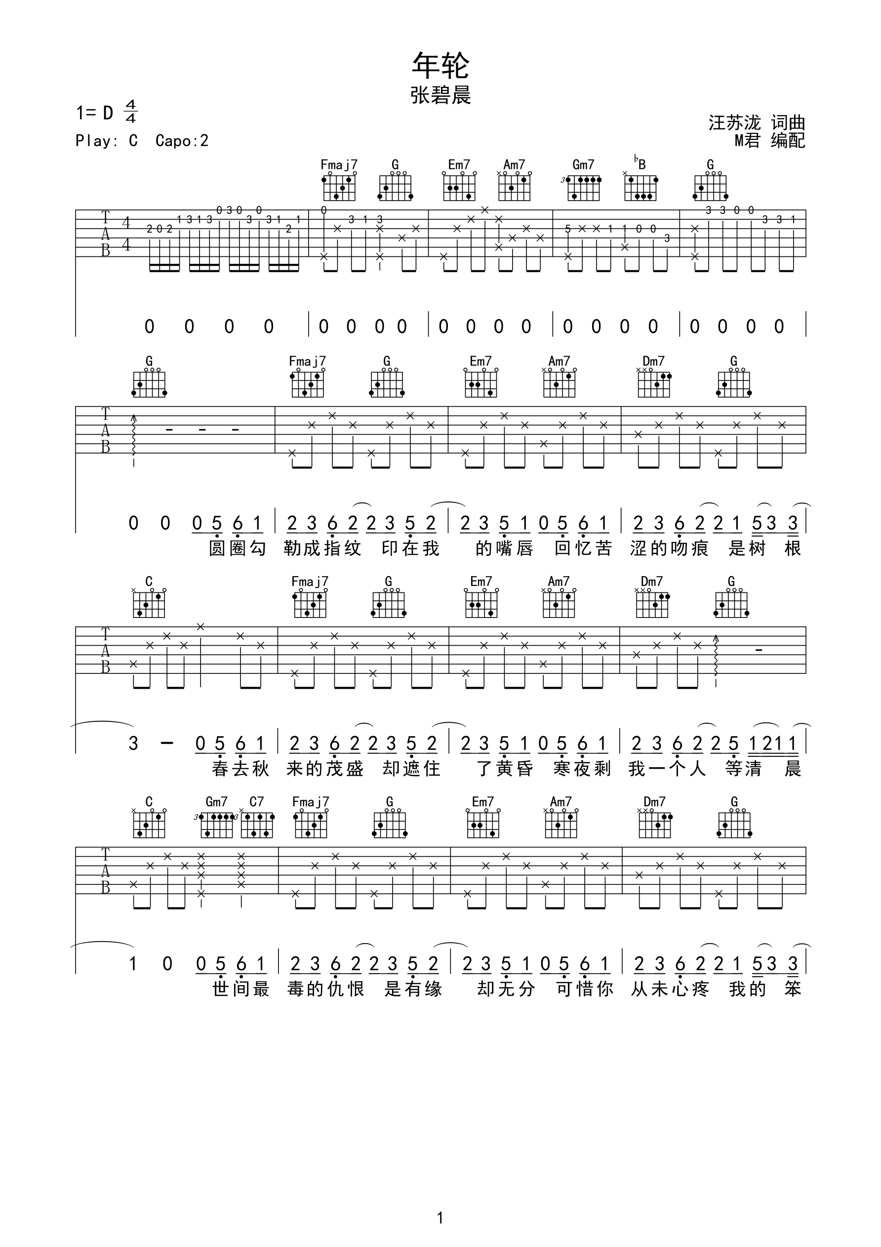 《年轮》完整编配d调六线pdf谱吉他谱-虫虫吉他谱免费下载