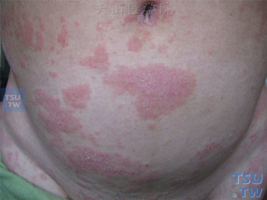 同一病人,腹部皮损,表面有细碎鳞屑