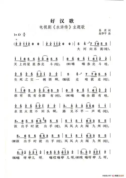 好汉歌(《水浒传》片尾曲)_歌谱简谱_哆来咪123曲谱网