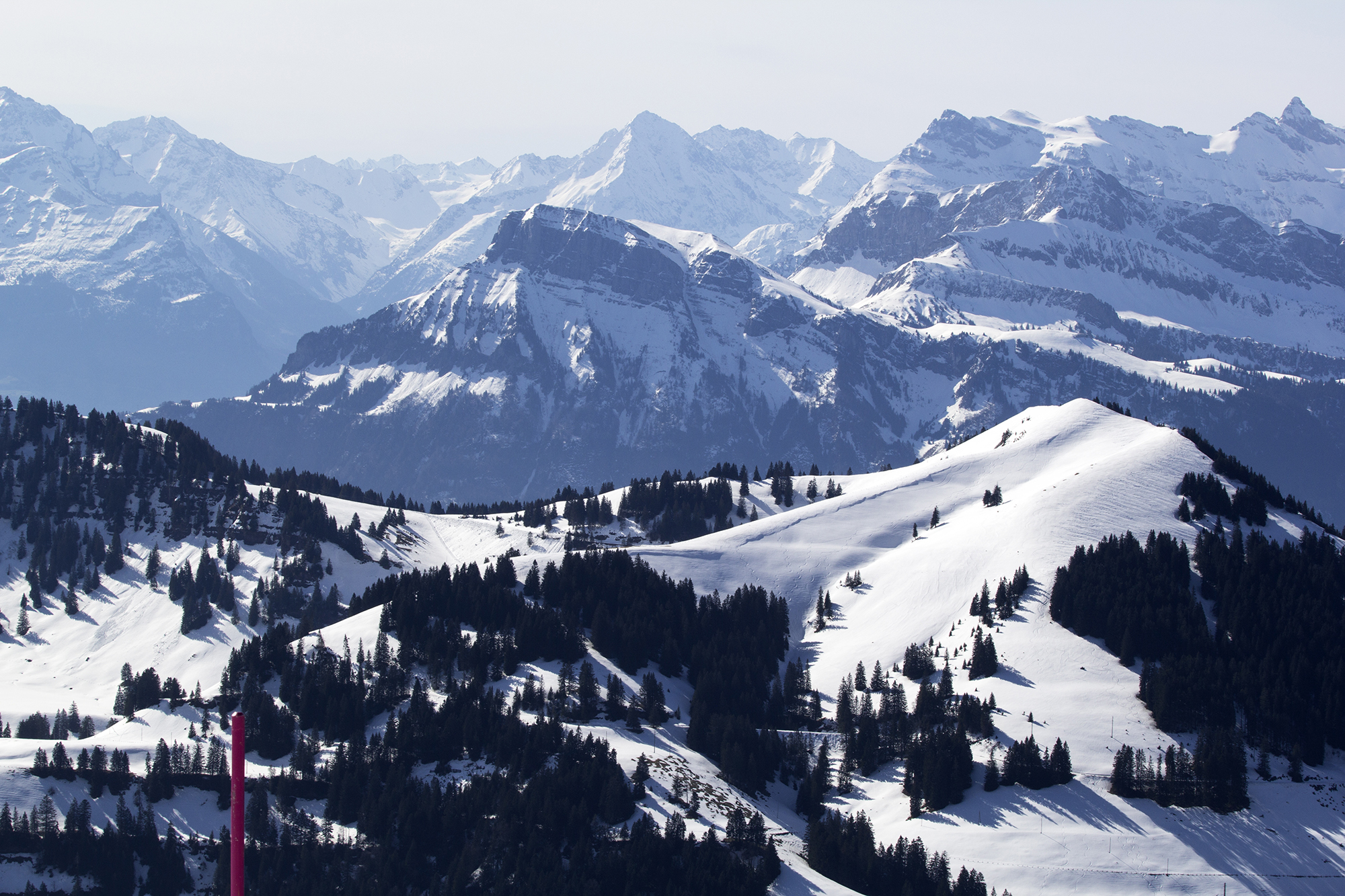 法国阿尔卑斯山景观和雪山风景在村镇圣莫里斯附近的莱弧滑雪胜地