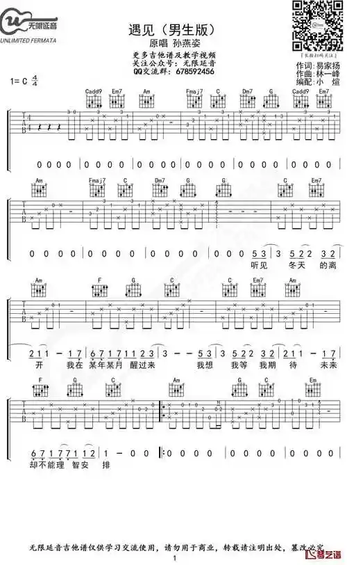 遇见吉他谱 男生版 孙燕姿 c调指法 无限延音编配1