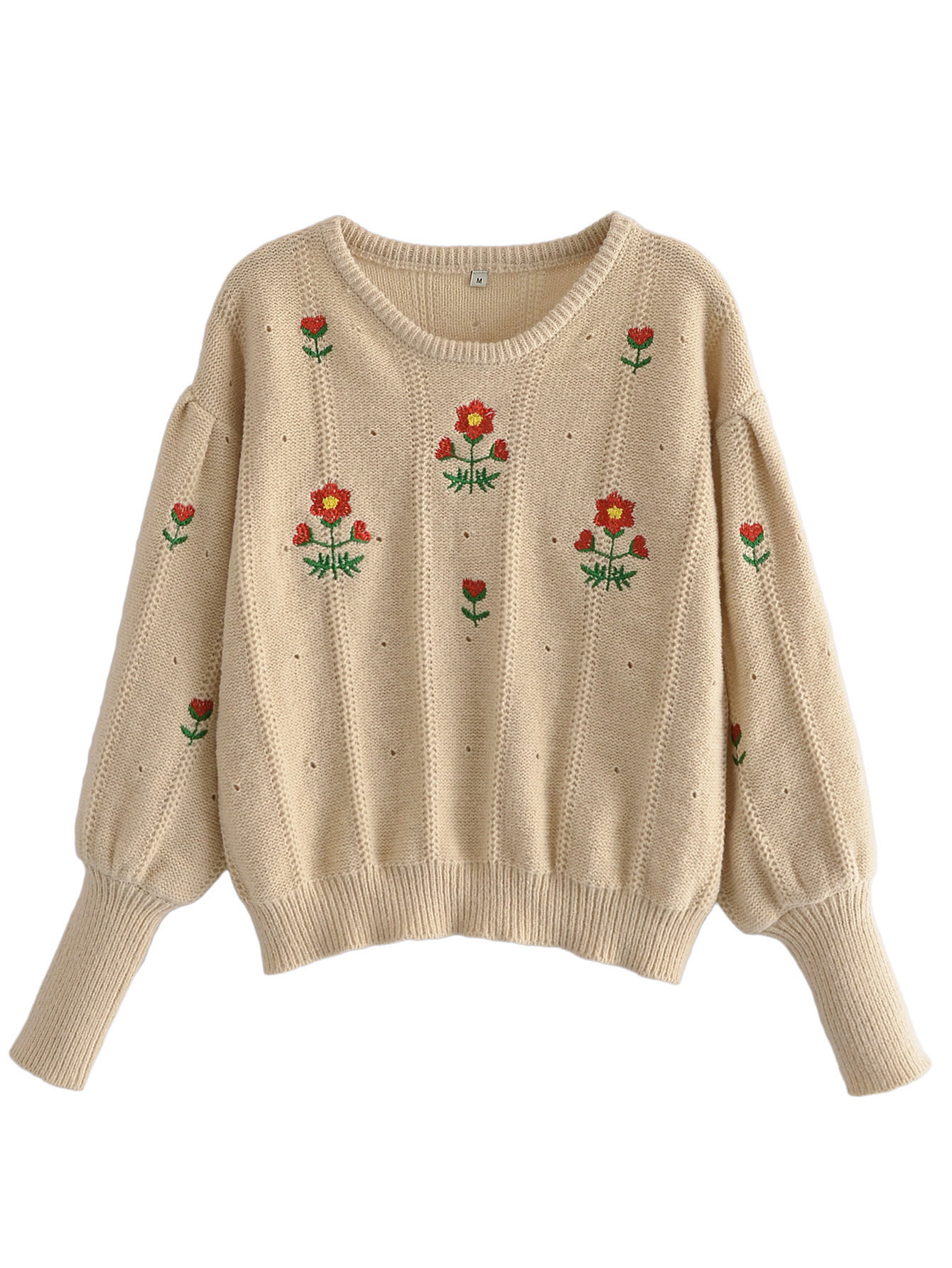 女装批发欧美风 花朵绣花圆领套头宽松针织衫毛衣