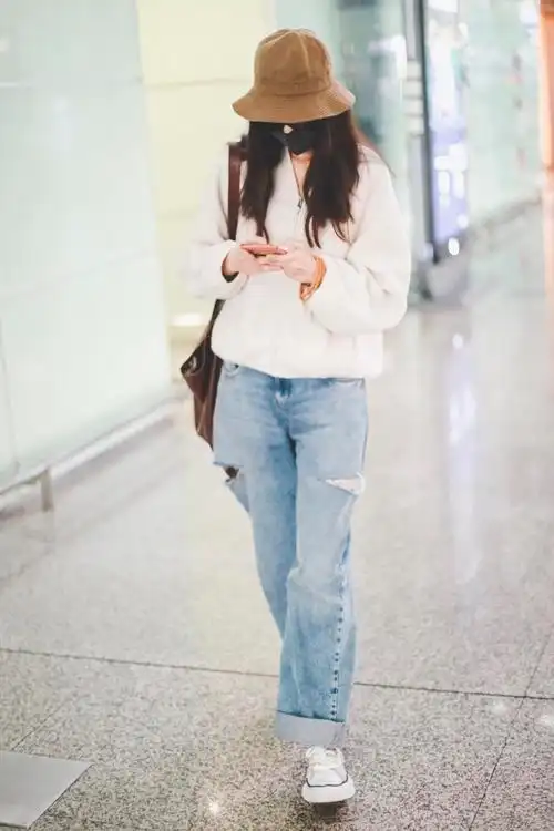 倪妮机场造型超美,条纹针织衫配牛仔裤清爽养眼,不愧为街拍女王