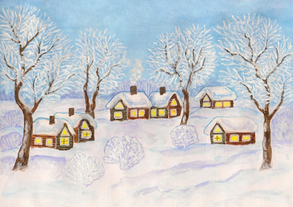 冬季山水画,手绘圣诞插画, 水彩和白色水粉, 冬季风景与村房屋和树木