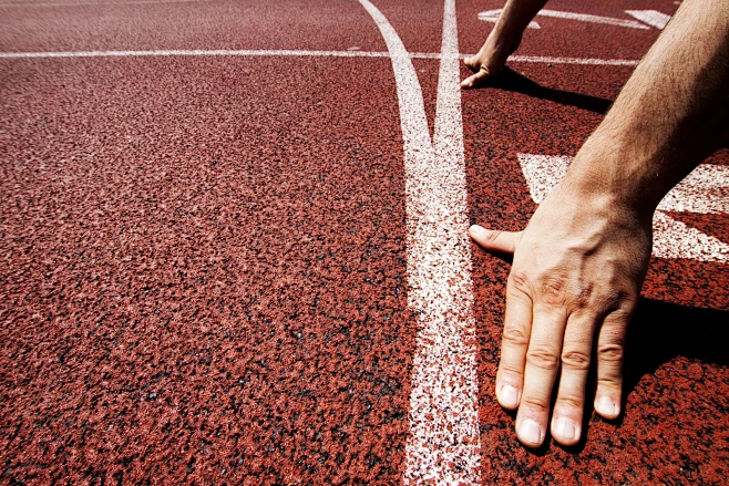 一个年轻的男运动员在蓝色跑道上起跑的背影