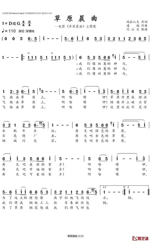 草原晨曲简谱-同名电影主题歌简谱 - 曲谱歌词网