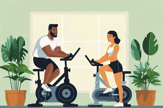 卡通手绘健身节插画健身房室内两人在动感单车上锻炼植物场景人物插画