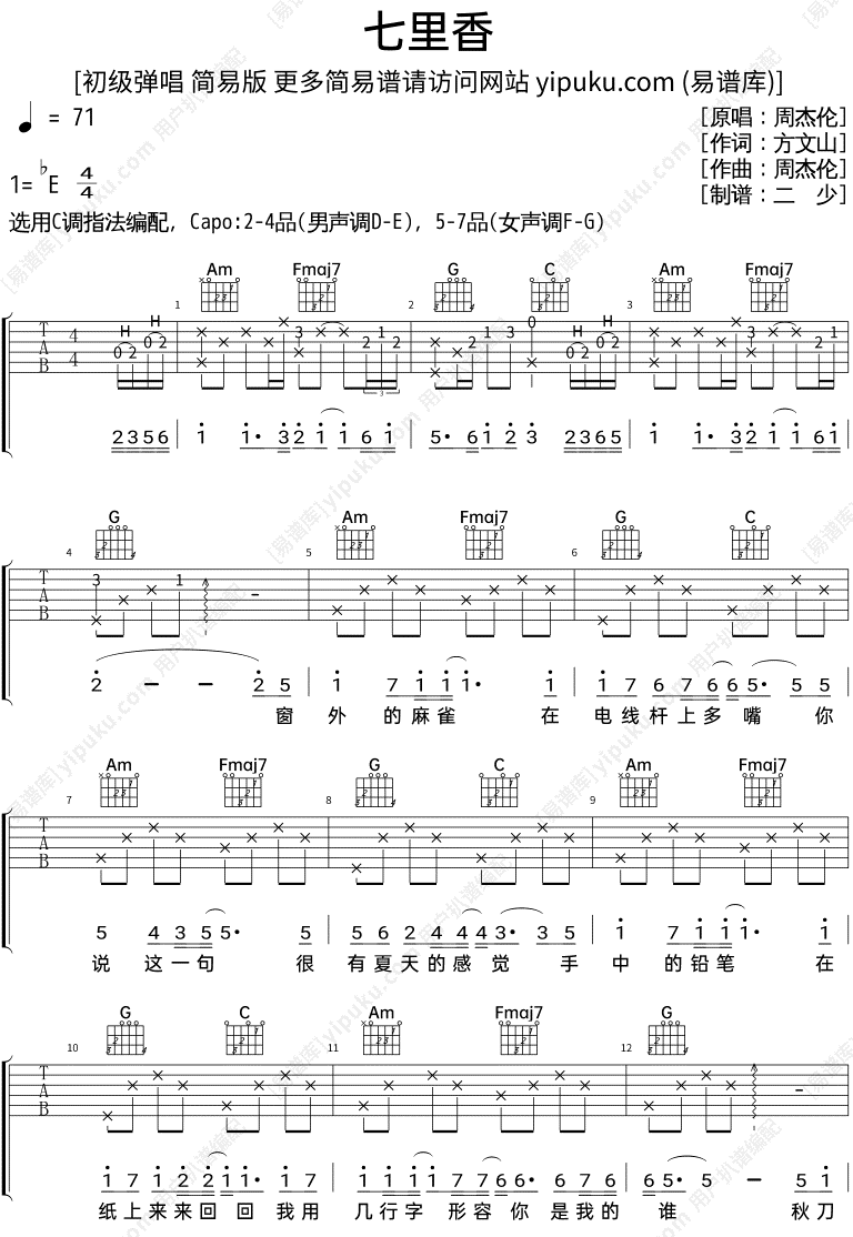 《七里香》吉他谱-c调原版弹唱吉他谱七里香指弹吉他谱-简单版独奏六