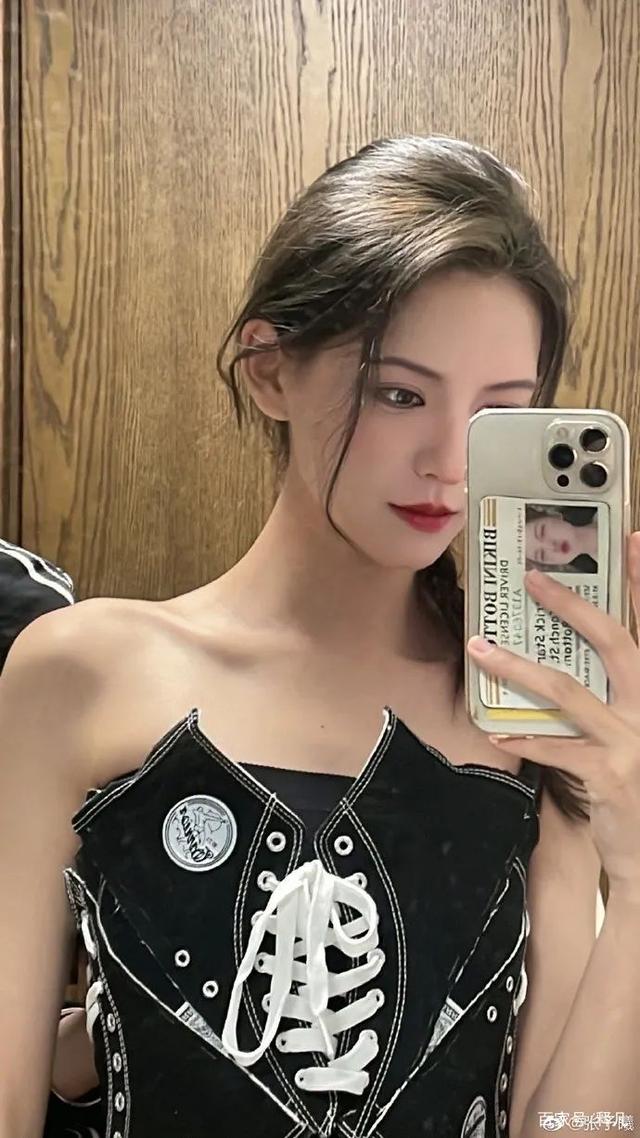 照片中的张予曦身着黑色露腰上衣,比例完美.