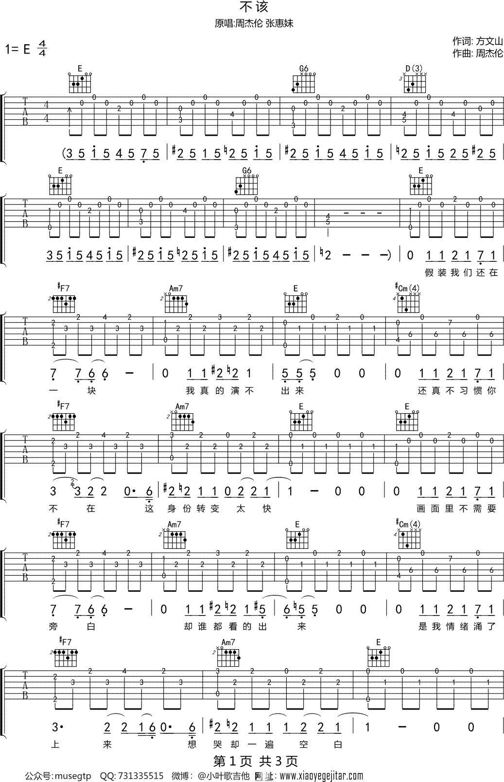 不该吉他谱_周杰伦_e调图片谱完整版