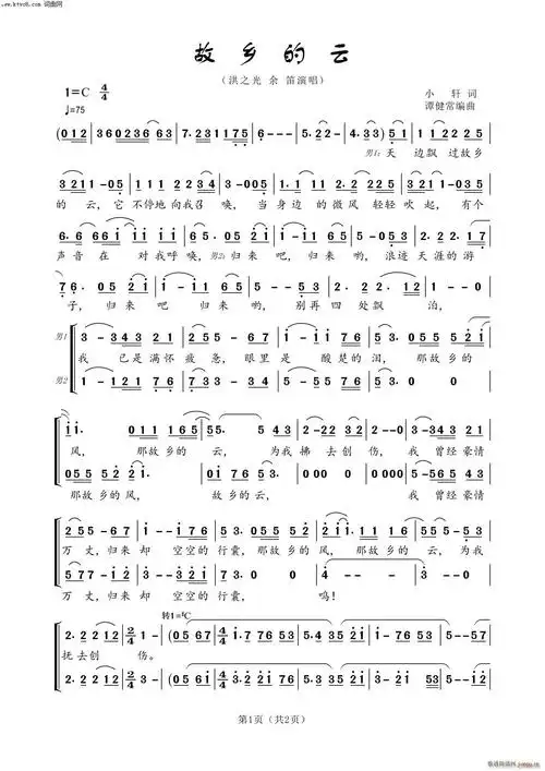 故乡的云(男声二重唱) 洪之光 余笛 歌谱简谱网