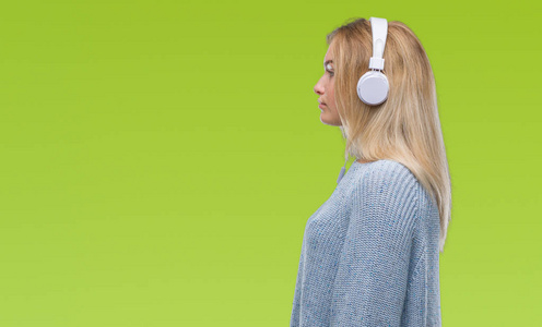 戴着耳机,在孤立的背景下,看着侧面放松的轮廓,自然的脸,自信的微笑