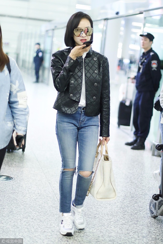 江疏影用牛仔裤打造酷帅风裤腿还缺一块走机场真新潮