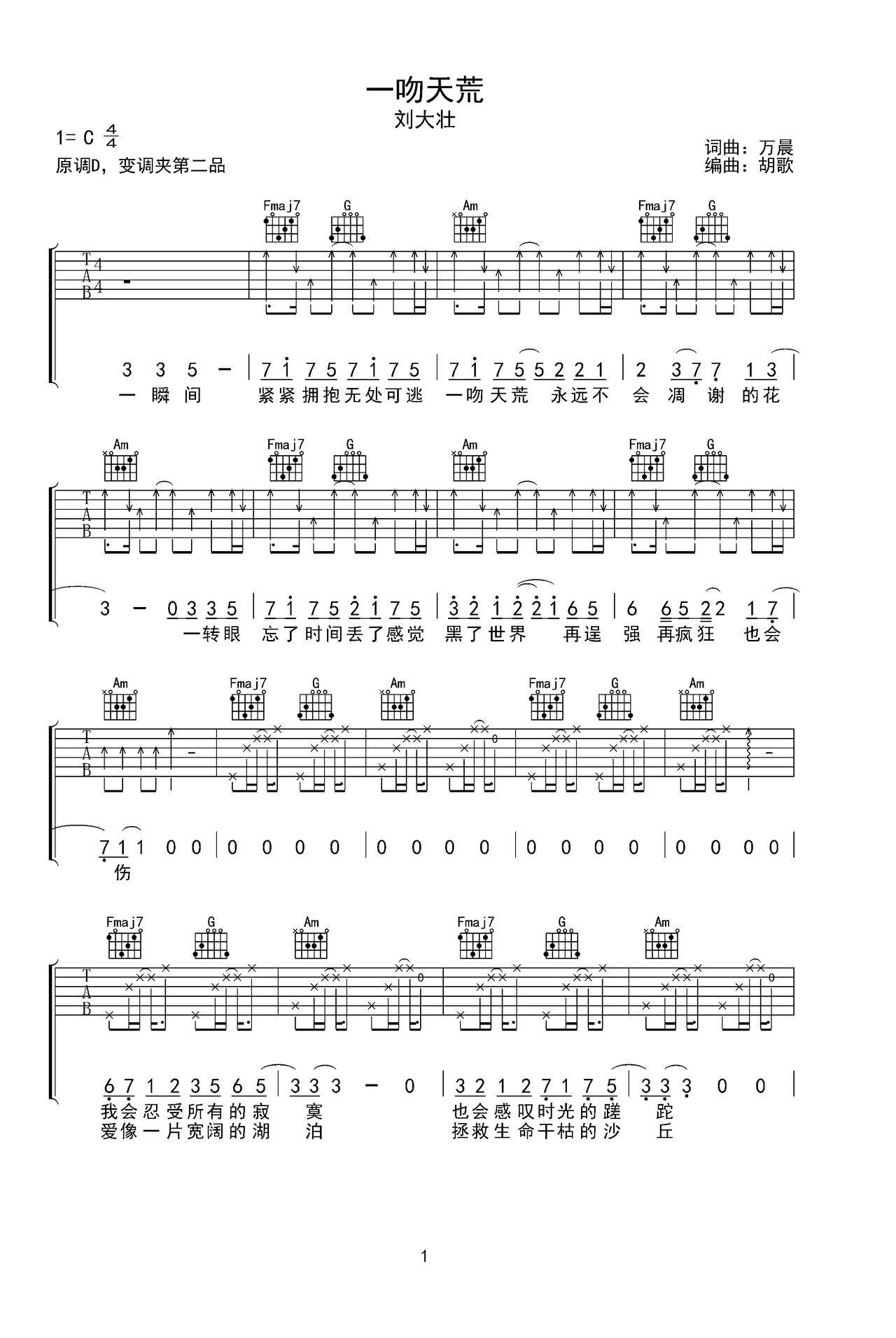 一吻天荒吉他谱刘大壮c调版吉他弹唱谱