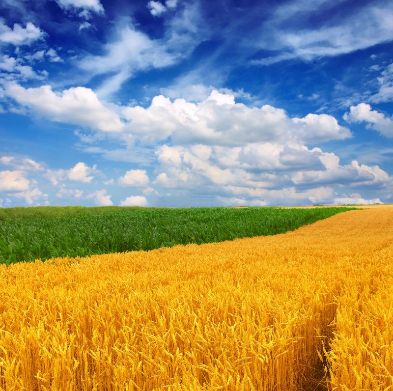 蓝天白云下丰收的麦田