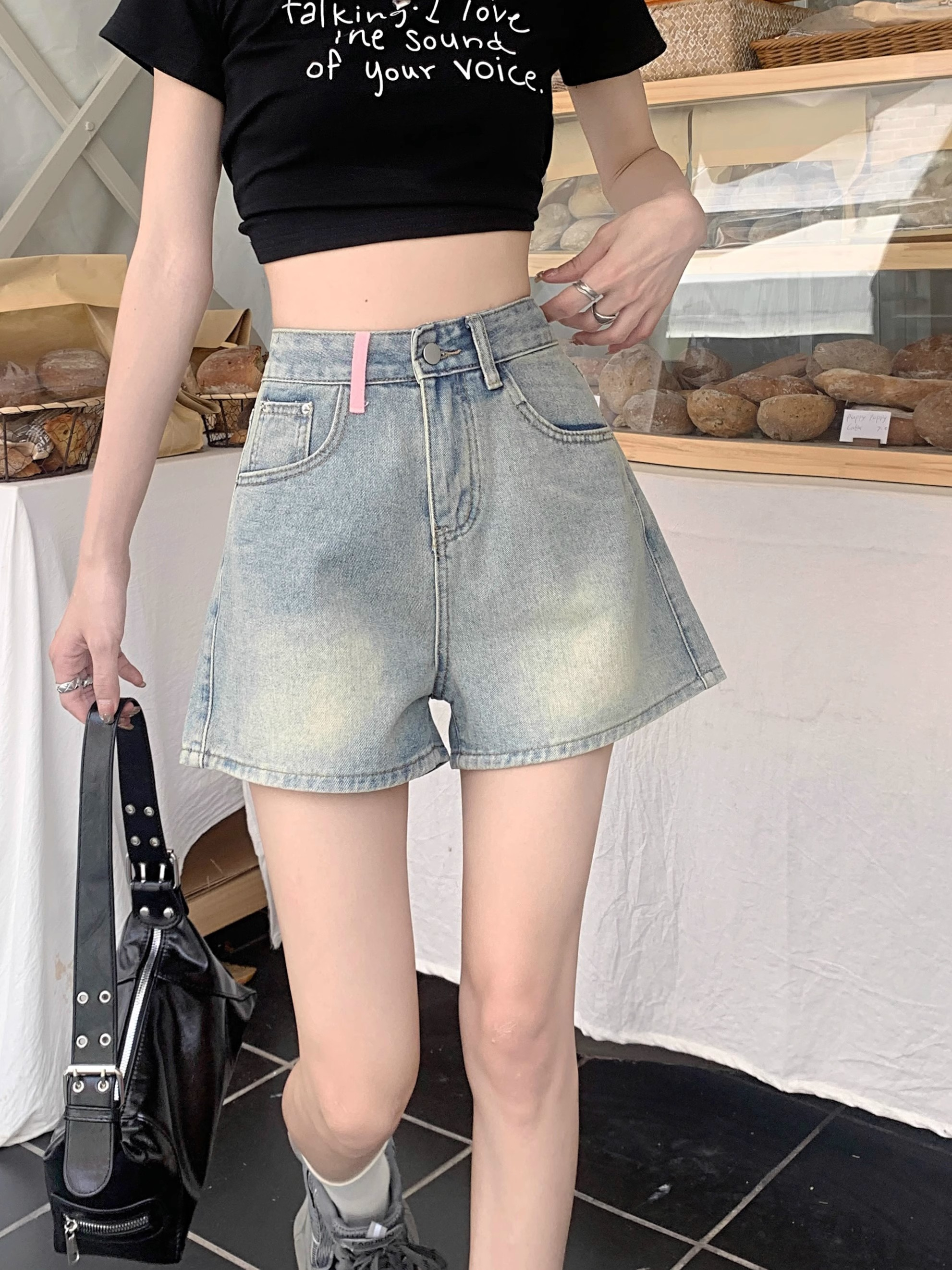浅色牛仔短裤女夏2021新款韩版不规则破洞阔腿高腰a字热裤潮ins黑色