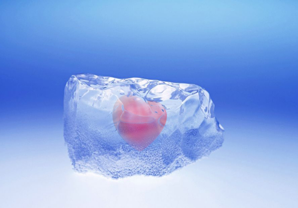 在冰壳中冰冻的心,红色的心满了部分融化的冰壳.在白色隔离