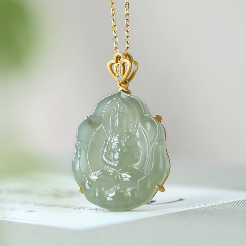 荟宝丽s925纯银镀金镶嵌和田青玉观音玉佛无事牌中国风女吊坠挂坠