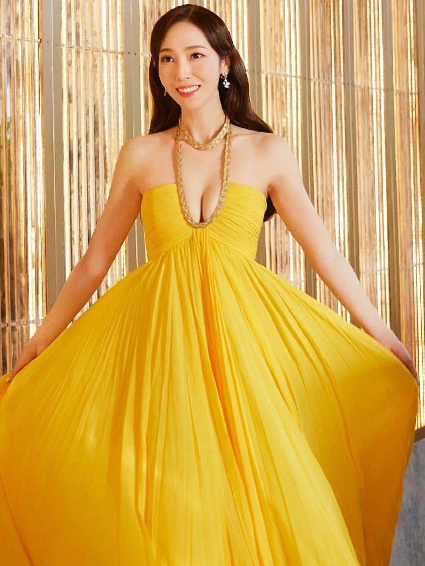 郑秀妍的多巴胺穿搭:黄色抹胸礼服裙
