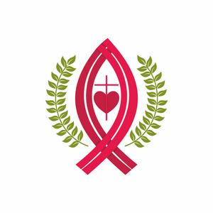 鱼教会教会的标志.基督教的象征.十字架,耶稣鱼和心照片