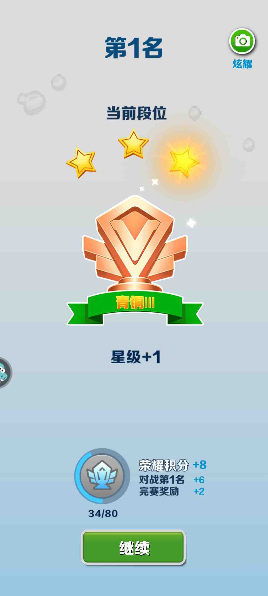 闯关成功后会弹出通关成功提示,并有星级评分哦,点击继续按钮