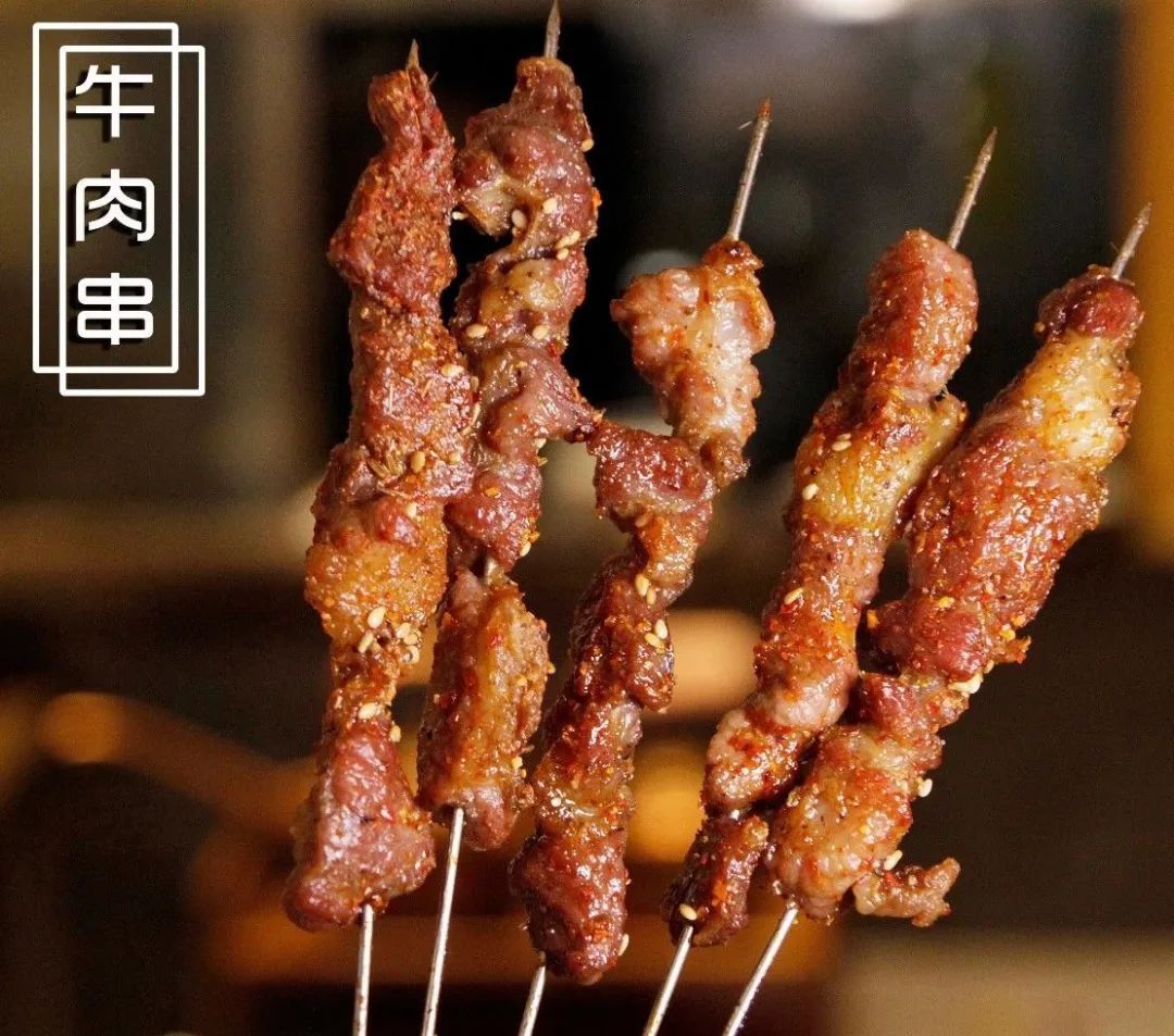 牛肉串3元/串鲜嫩的牛肉在大火的烤制下,散发着浓郁的香气.