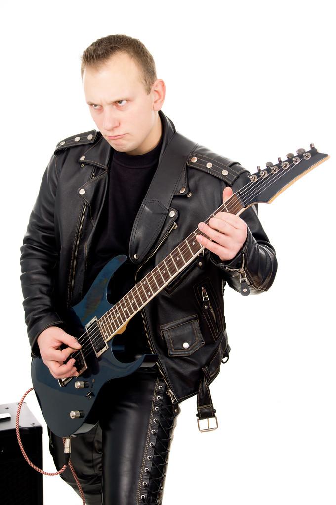 摇滚吉他手在皮革服装,与声音放大设备