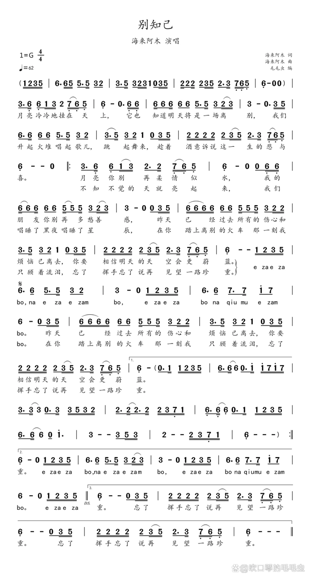 别知己简谱 别知己吉他谱 原版g调 海来阿木别知己的真正含义-曲谱室