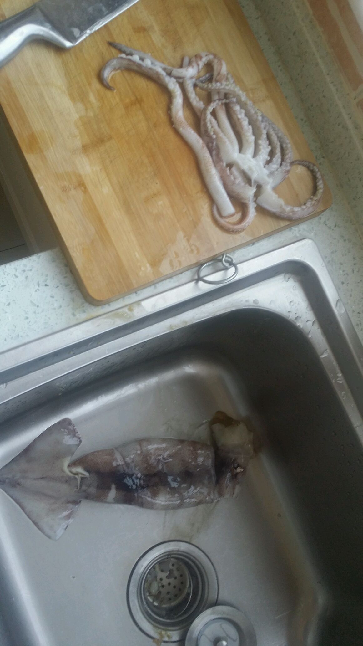 把鱿鱼须从头部分离下来.分解完毕,去黑膜!
