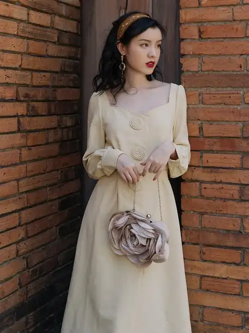 nokotoo轻奢品牌女装法式气质方领连衣裙女神范春季2021新款收腰修身