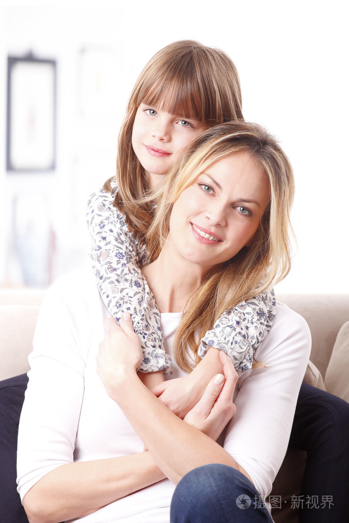 母亲抱着女儿的身影, 在清晨享受着美景, 温馨的心情.