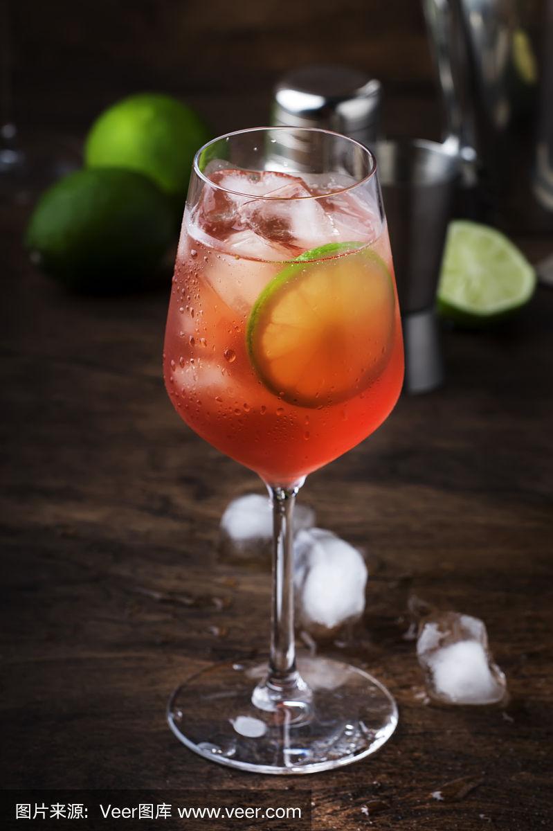 金巴利汤力酒精鸡尾酒,红苦,汤力,酸橙和冰.
