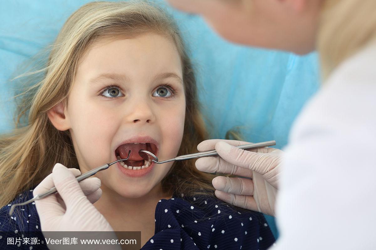 小女孩张大嘴巴坐在牙科椅上接受医生的口腔检查.拜访牙医的办公室.
