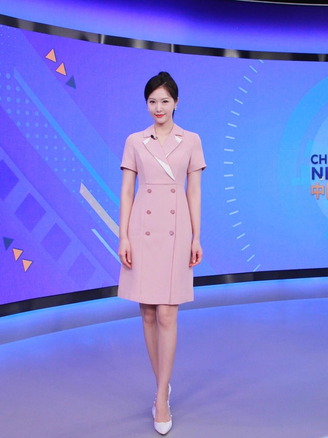 马卡龙粉西装裙主持人上镜装