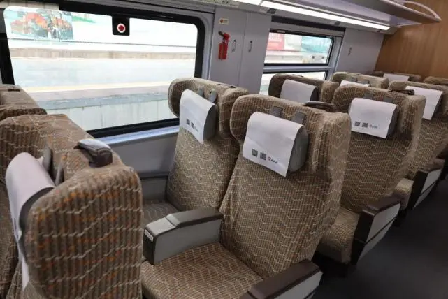 列车头尾为一等座车厢,左右两边各2个座位,中间6节是二等座,每排5个