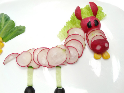 儿童动物食物. 用米熊和奶油汤洗澡.